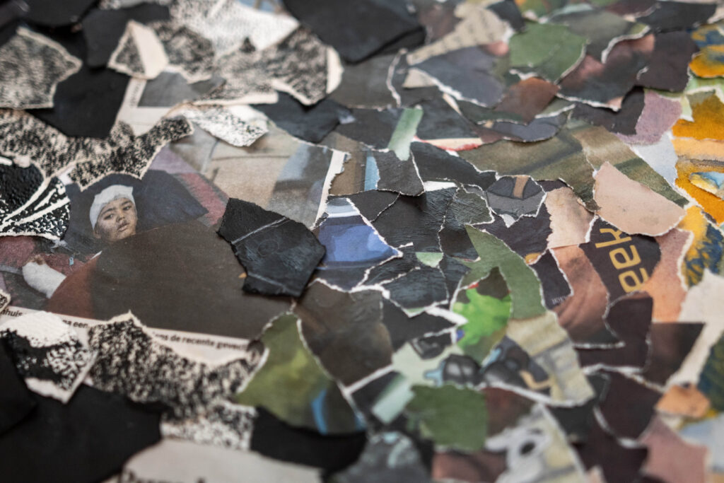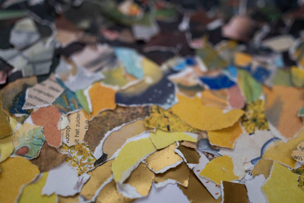 Door deze beelden te knippen, drukken, stempelen en opnieuw te rangschikken ontstaat ruimte. Ruimte om te voelen wat woorden alleen vaak niet kunnen dragen. Zware realiteit en zachte verbeelding bestaan hier naast elkaar, soms schurend, soms verrassend harmonieus.